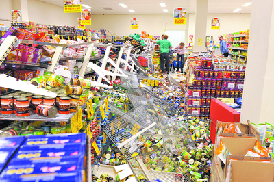 Three shelves collapsed scattering goods across two aisles, and panels in the storage room ceiling were dislodged.