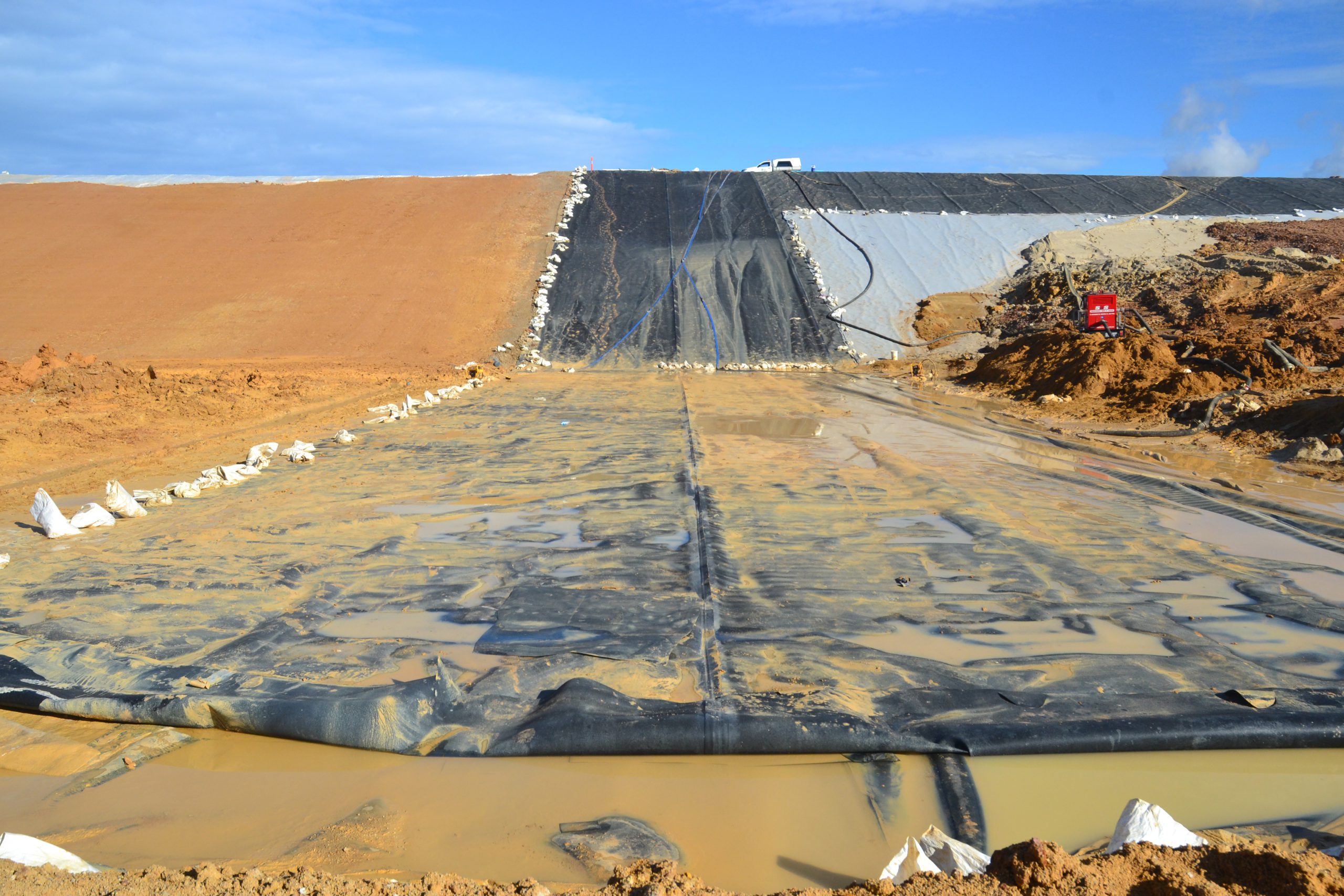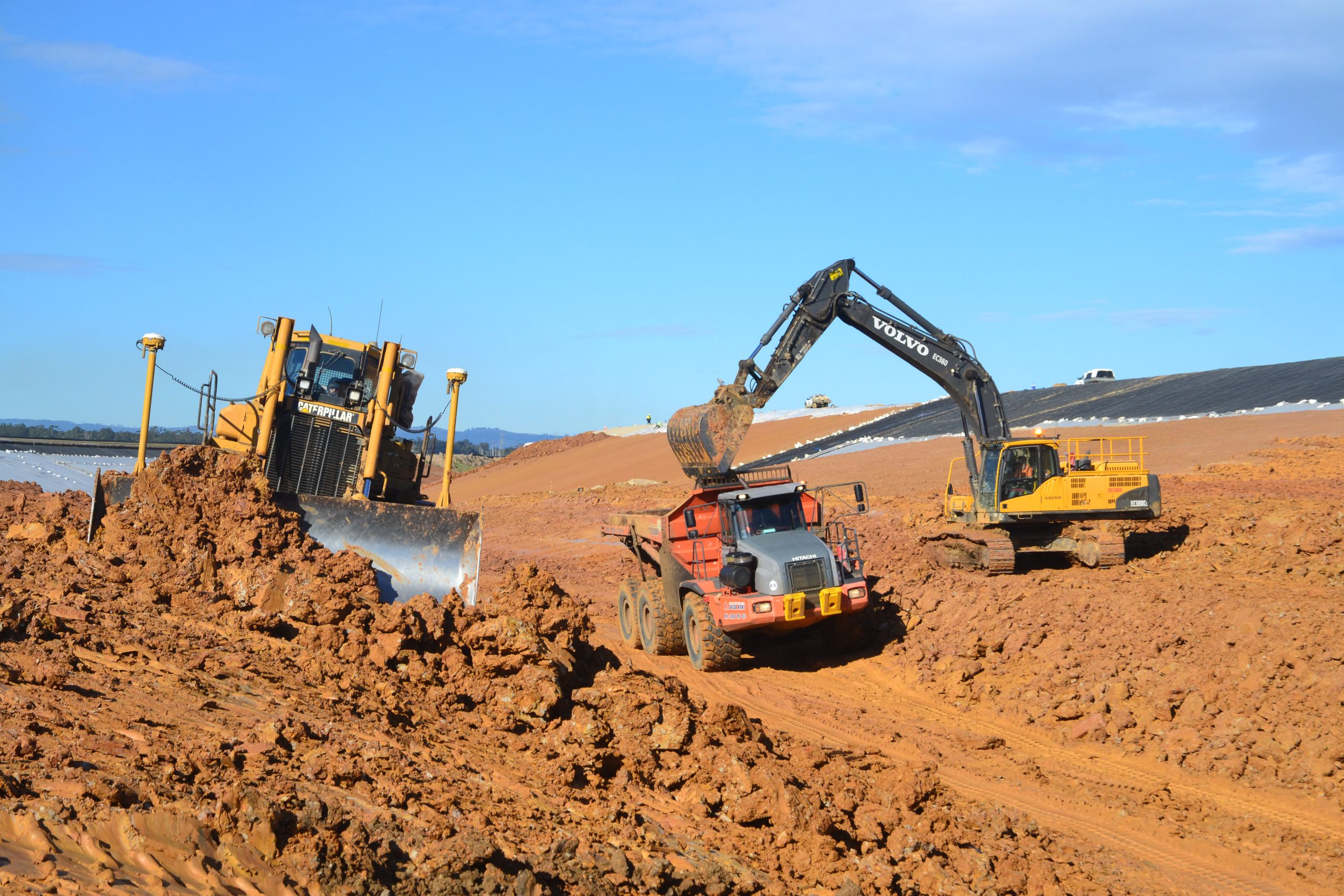At the northern end, near the levee’s original breach point, a team of workers and excavation equipment work through sticky clay to install an 800 metre liner system – incorporating nine different layers, double seam welded at the joins.