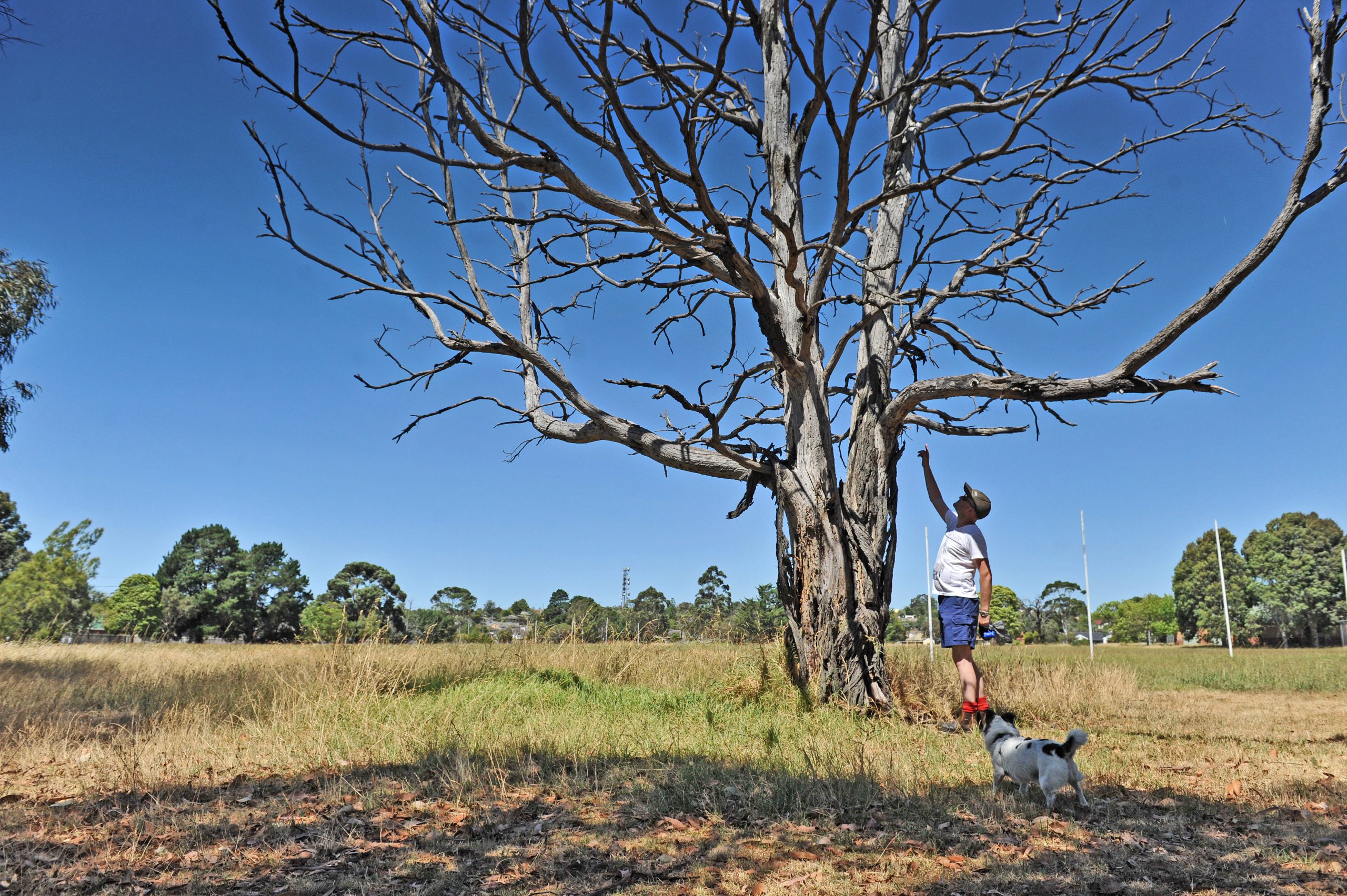 About eight dead trees remain unattended, self-seeding trees are pushing the fence line along the perimeter of the property and a large mound of logs have been left in the middle of the oval – now overgrown with weeds and grass.
