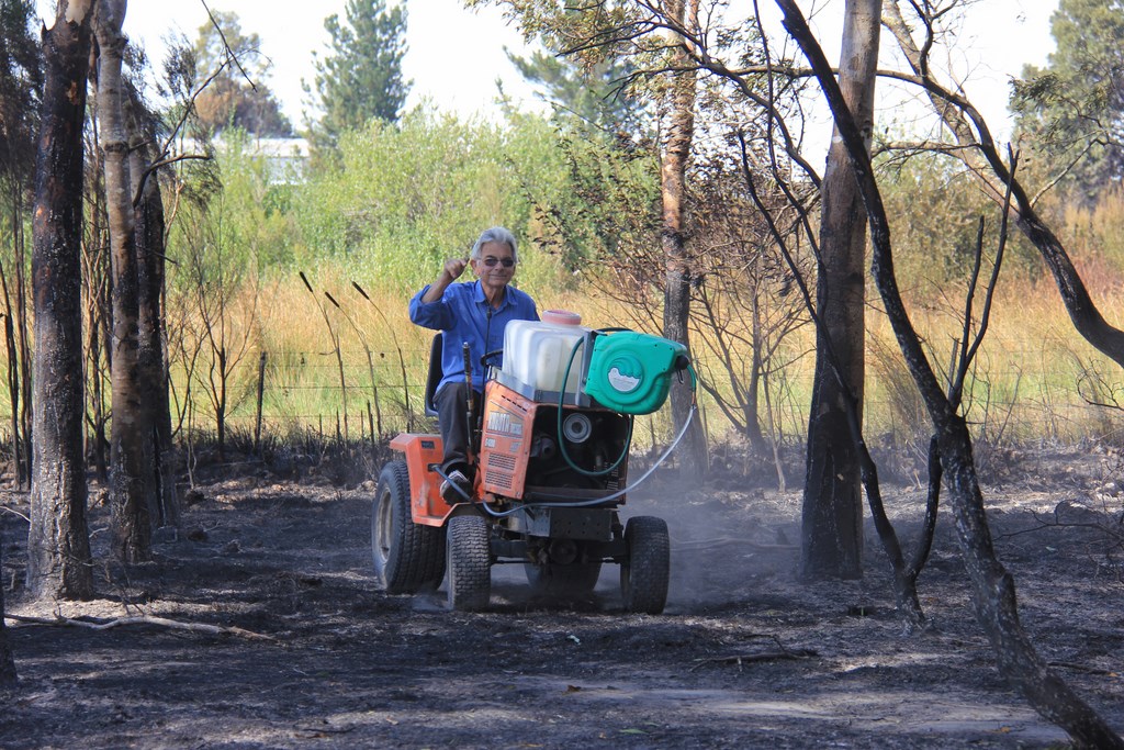 Grinstead arrived at the clubrooms on Sunday morning to move TCA machinery onto the short grass outside where it was less likely to burn, however when he went to leave found Toners Lane was alight at both ends. With no exit route available, Grinstead helped move some trapped cattle to the Gippsland Historic Automobiles Club before attending spot fires with a garden hose.