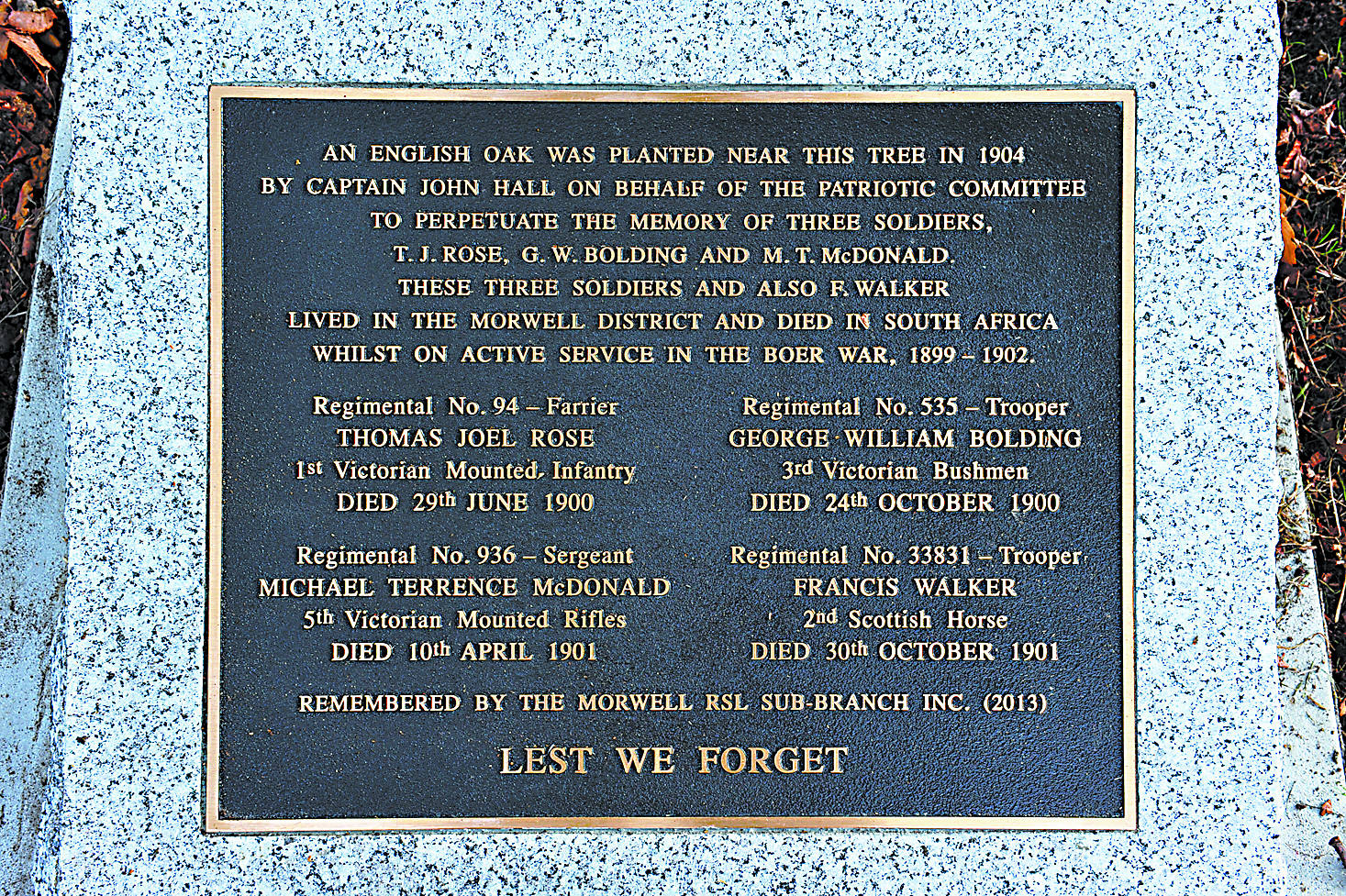 The three soldiers – Thomas Joel Rose, a Farrier of the 1st Victorian Mounted Infantry, Michael Terrence McDonald, a Sergeant of the 5th Victorian Mounted Rifles and George William Bolding, a trooper in the 3rd Victorian Bushmen – all died in South Africa and lived in the Morwell district.