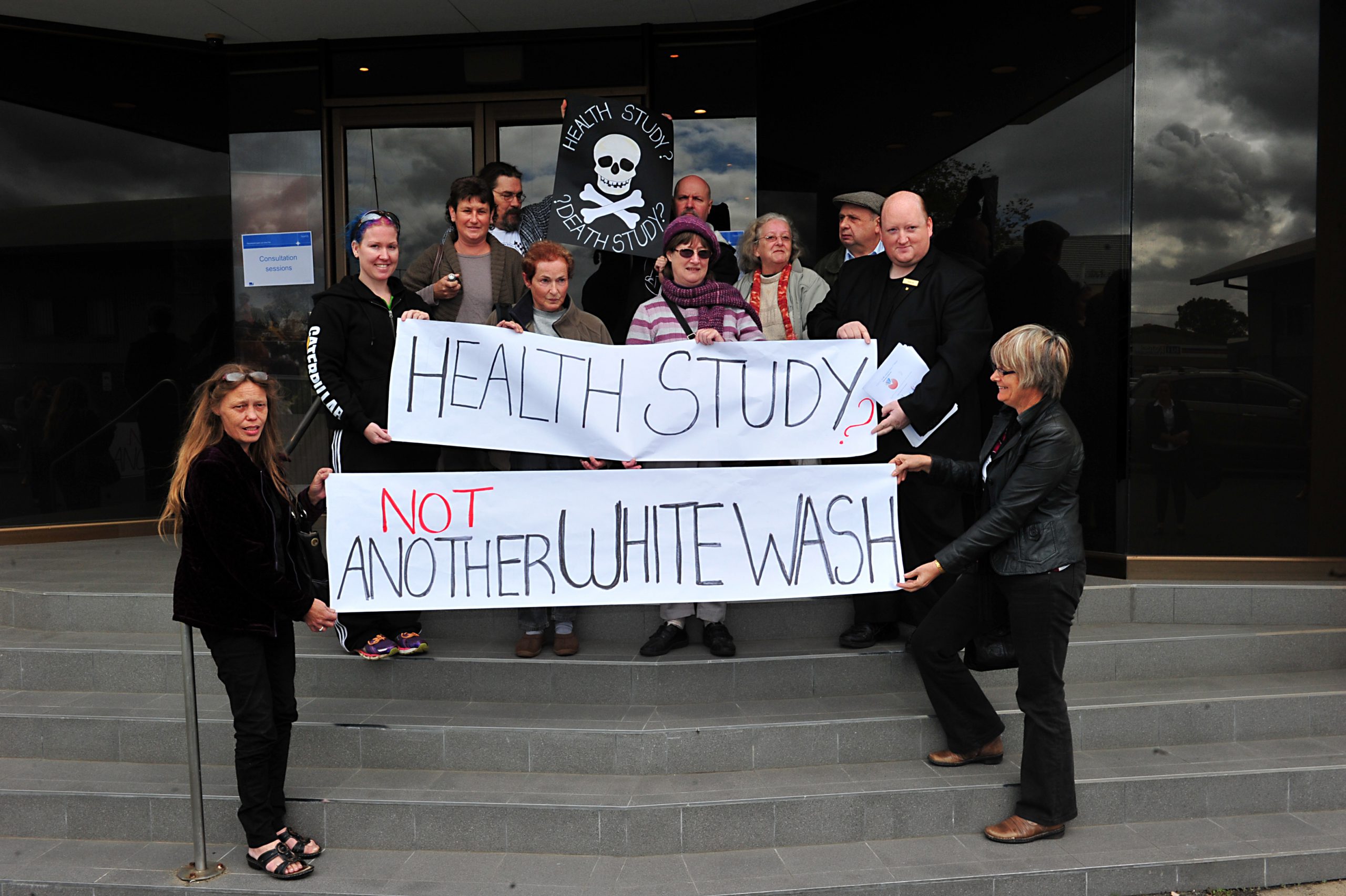 Members of Voices of the Valley, a community group set up in the wake of the smoke crisis, staged a small protest outside the meeting, carrying banners reading ‘health study – not another white wash’ and ‘health study? death study?’