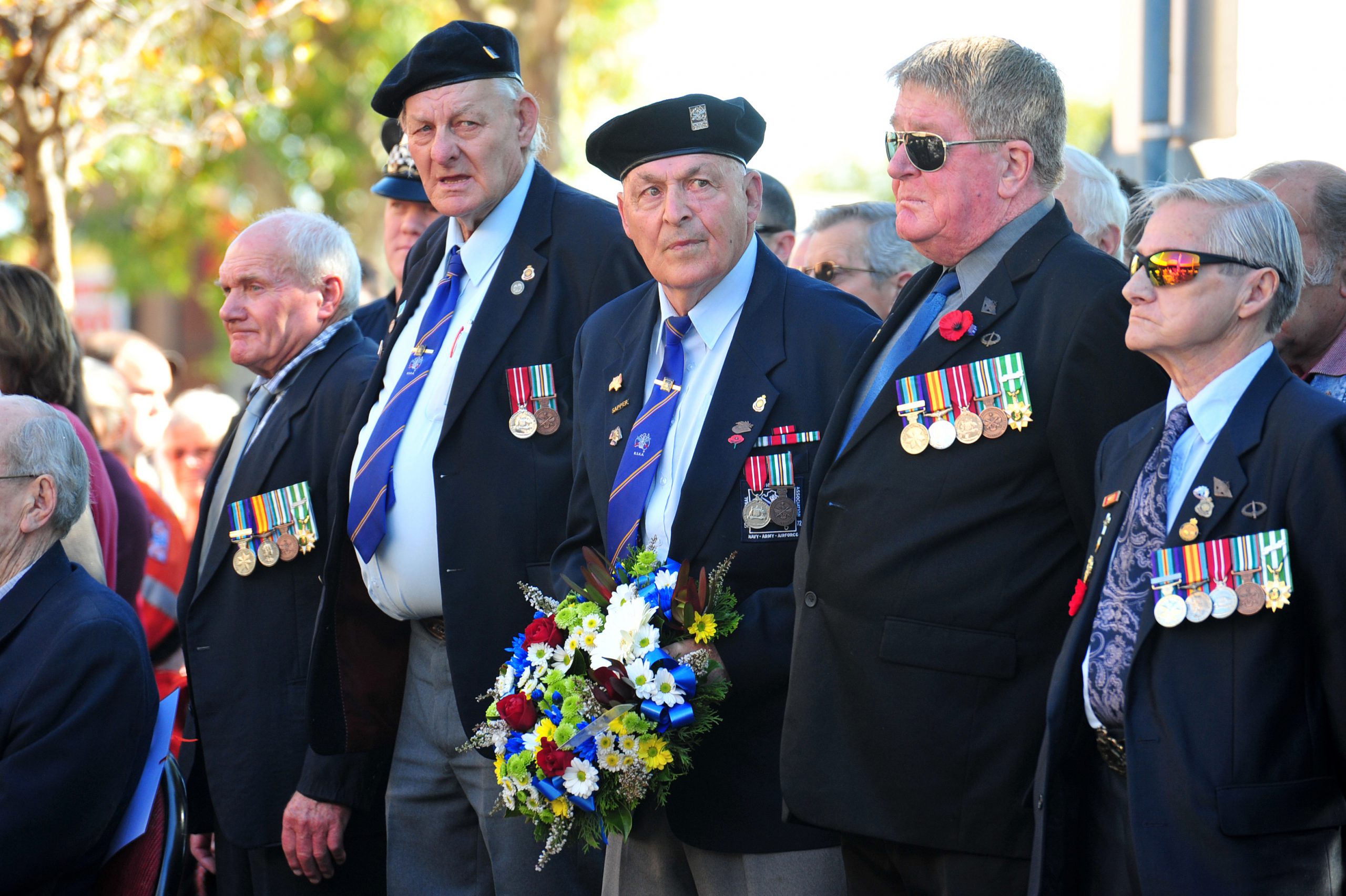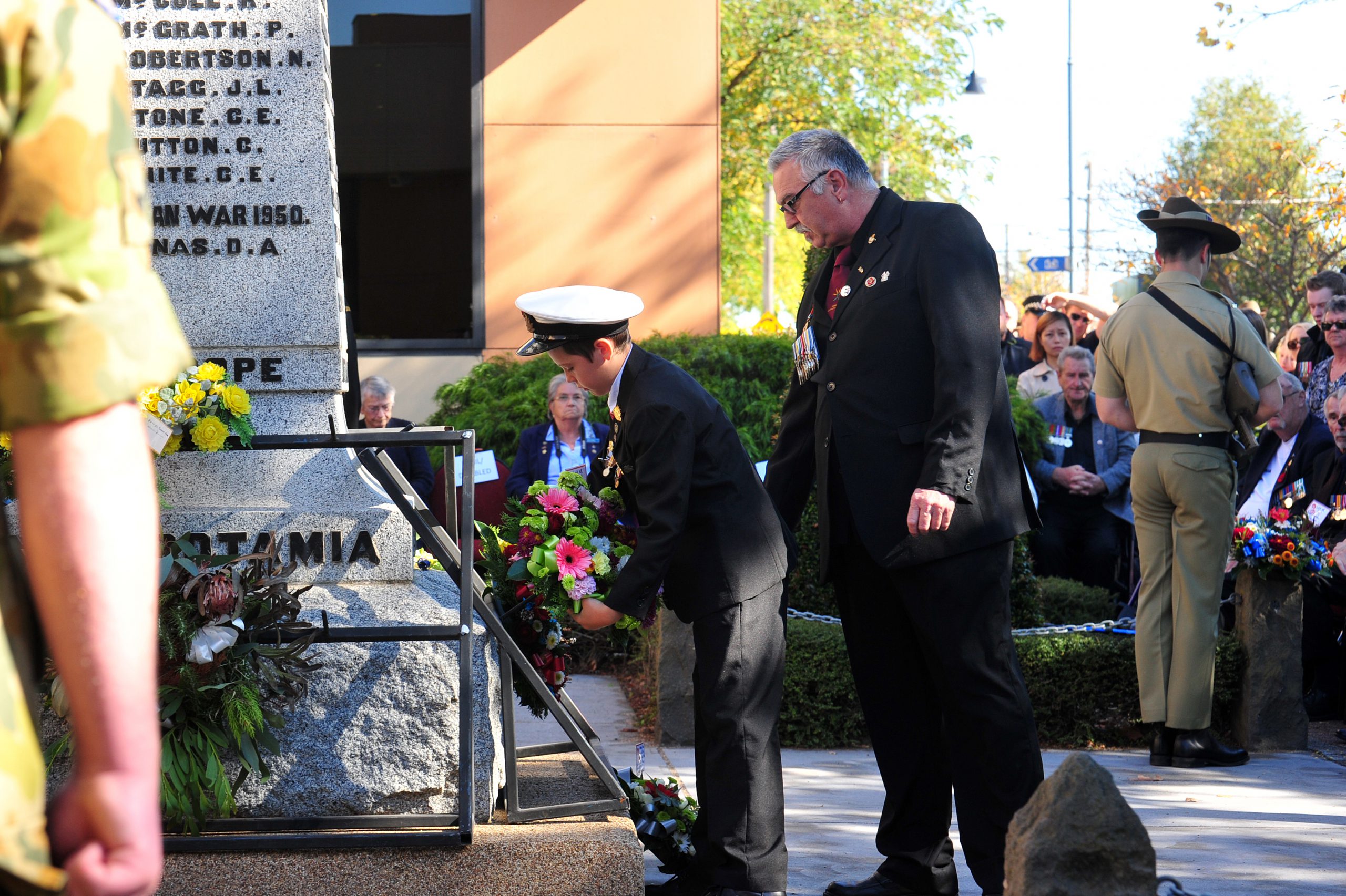 Young and old gathered in Newborough Square to mark Anzac Day, laying wreaths and pausing in solemn respect.