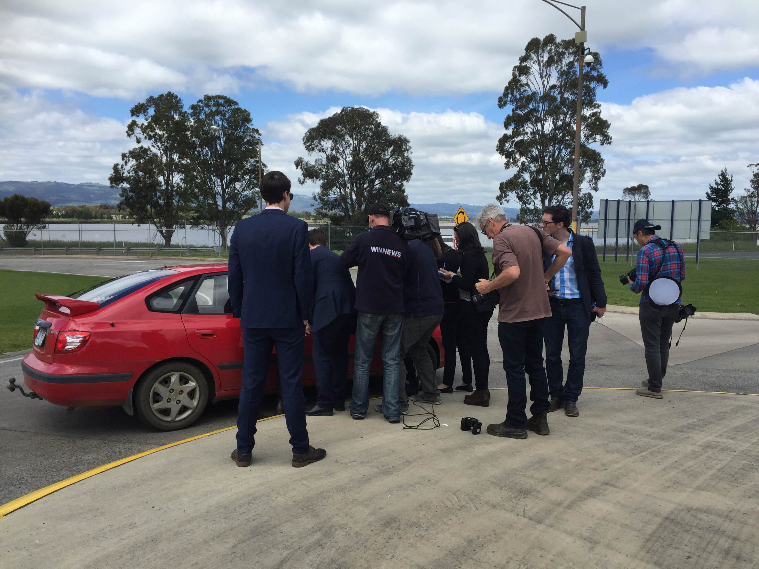 Media surround a Hazelwood worker leaving the plant.