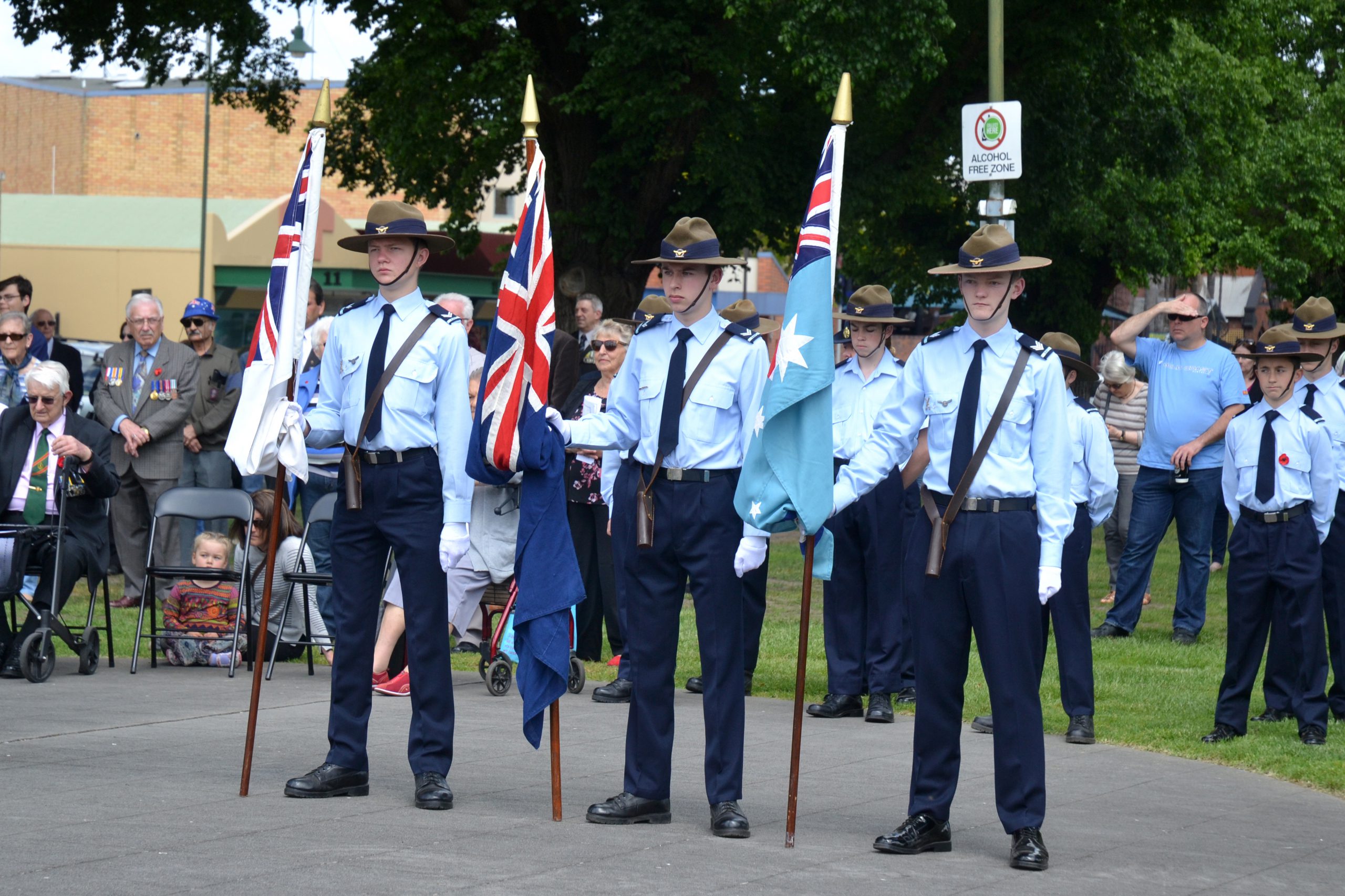 The minute silence began with the reading of the Flanders Field poem by local primary school students, and ended with a trio of female flag bearers from the Air Cadets raising the flags from half-mast.