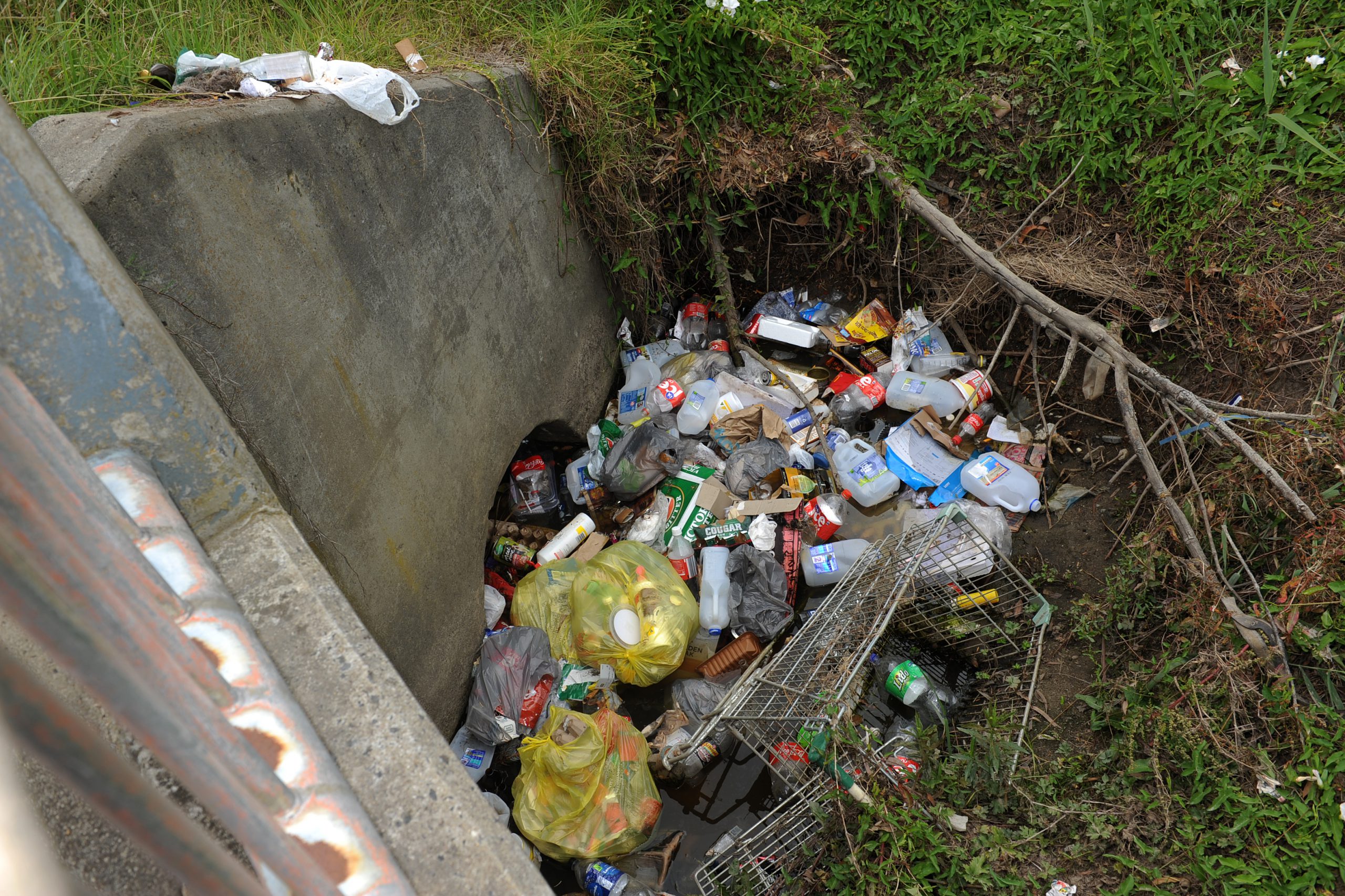 Egg cartons and milk bottles to beer packaging and several bags of household waste have built up in a section of the drain along the creek.