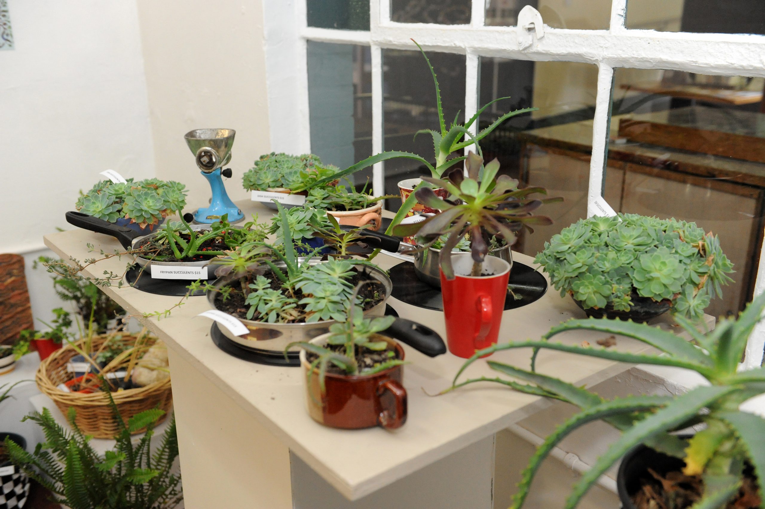 Tiny succulents grow in tea cups and mini gardens fill fry pans and all are for sale to raise money for the gallery.