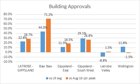 Ms Nield said there was an 8.8 per cent decline in building approvals in the Latrobe Valley compared to its longer-term average, but a 1.5 per cent increase since the Melbourne peak.