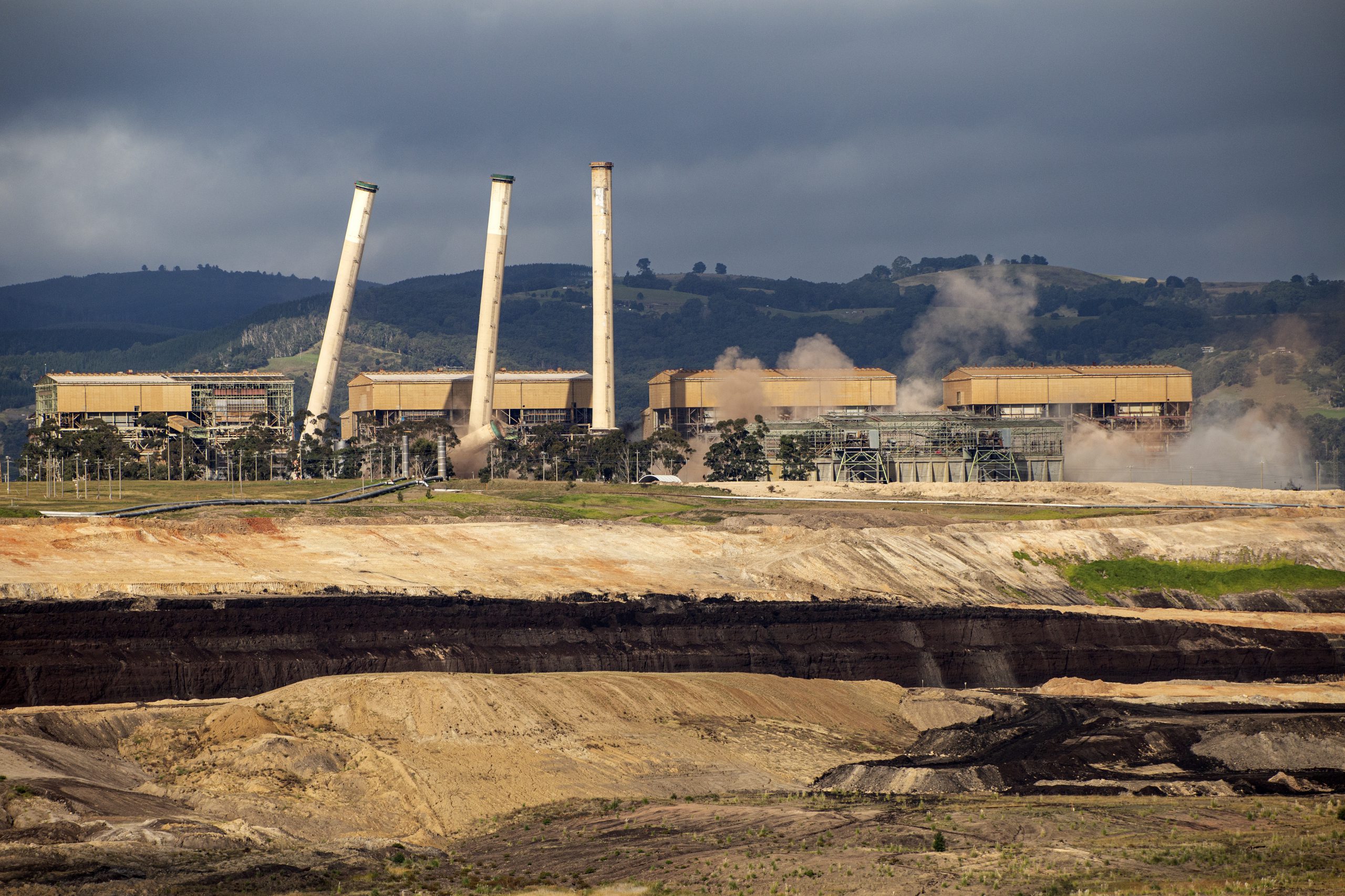 It was showtime at 12.27pm when the first chimney was detonated and took less than a minute in total for the 137-metre-high stacks to be reduced to rubble, signalling the end of an era for Hazelwood.