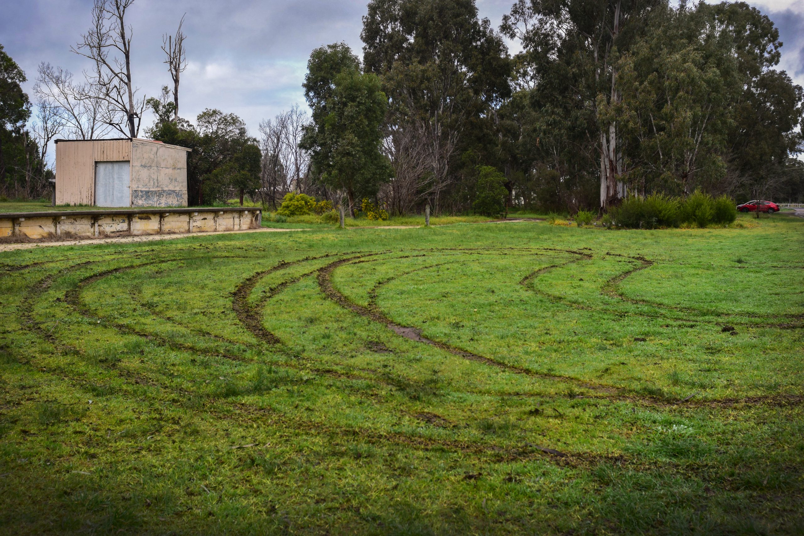 Empty acrylic paint tubes and spray cans were left scattered around the cafe and the grass area around the Apex Park was also torn up by car tyres.