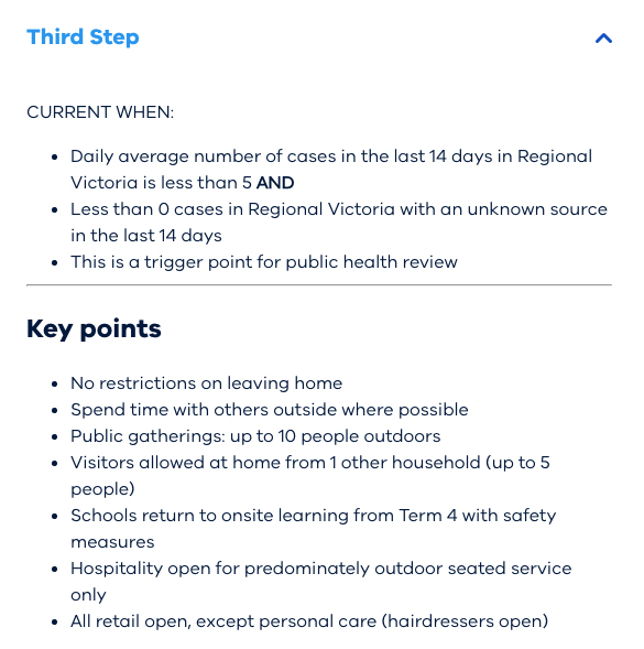 “We will reassess based on total numbers … but regional Victoria will more or less be able to move to the third step quite soon,” he said.