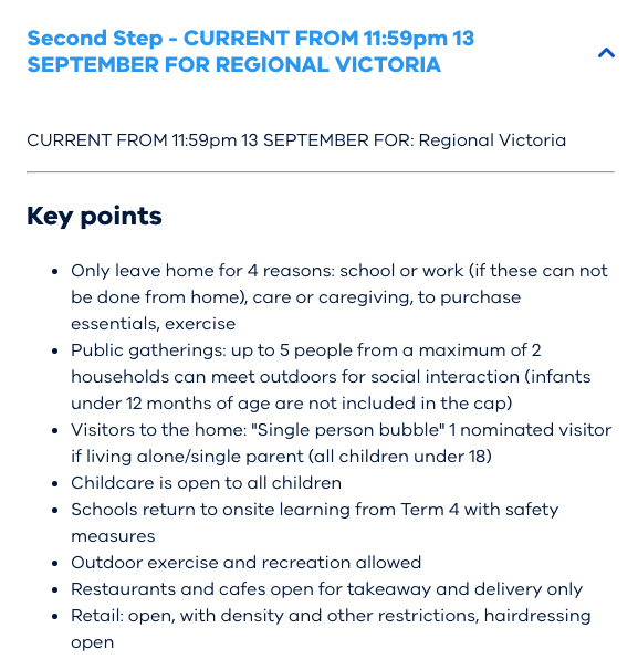 From midnight on Sunday, September 13, regional Victorians will be allowed public outdoor gatherings of five people from a maximum of two homes.