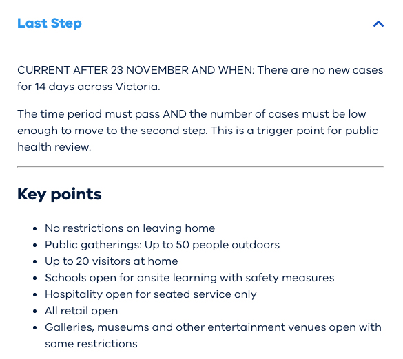 Premier Daniel Andrews said regional Victoria’s progression towards the last step of the plan – the “COVID normal” – depended on the maintenance of low daily case numbers.