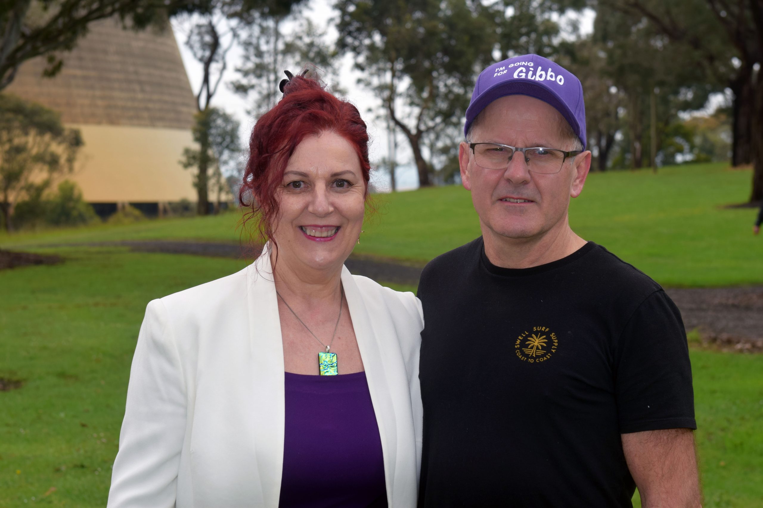 Supporters wore purple caps with the words ‘I’m going for Gibbo’ sprawled across the front.