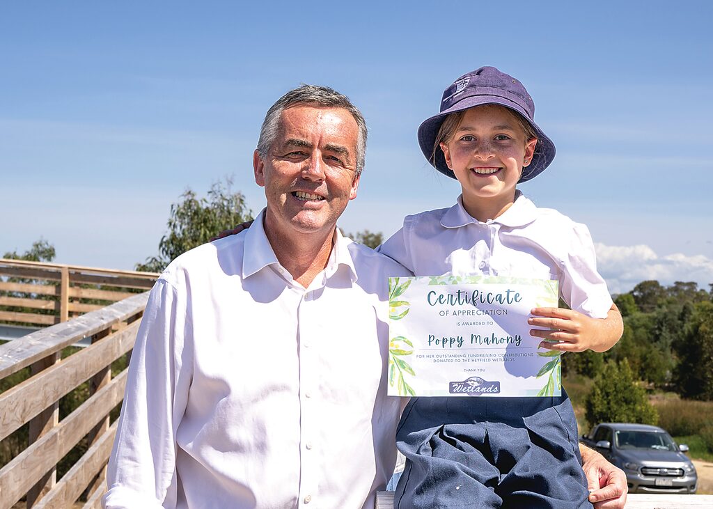 Leader and future leader: Federal Member for Gippsland Darren Chester and 10-year-old St Michael’s Primary School student Poppy Mahony at the official opening of the Heyfield Wetlands viewing platform last Thursday.