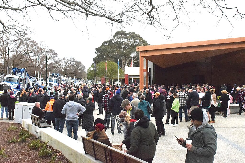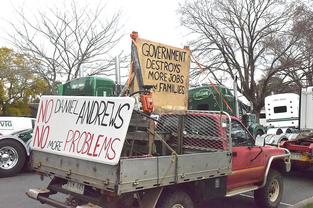 ABOUT 500 people attended another timber rally in Traralgon last week to protest against the state government’s policy to close the native timber industry in January. Held at Gippsland Performing Arts Centre (GPAC), people came to hear from the Gippsland People’s Council, Wellington Shire Council, the Victorian Farmers Federation, East Gippsland’s Councillor Sonia Buckley and a few Latrobe City Council members. Their target was the Premier, Daniel Andrews, and the Greens for not having forestry knowledge or for using misinformation to adhere to the closure decision. “At least with the 2030 closure announcement, they could work until then and have plenty of time to either figure it out or to reverse the closure,” Gippsland People’s Council member, Darryl Bird, said. “They were all going to be working until 2030 so they all went out and invested in machinery and they were going to try and sustain the living for another six to seven years. Pay off debt and maybe he (Andrews) wouldn’t be there so they would keep the timber industry. They now have all of this debt. All those families are shattered.” Even through wet and cold weather, people kept joining the rally from 11am until 2pm when the speakers had finished. Altogether there were 10 speakers which included Darryl Bird (Feathers), Carleen Haylock, Noel Blundell, Mark Hollman, Wade Northausen, Cr Dale Harriman, Cr Sharon Gibson, Gregory Forster, Michael Morrison and Cr Sonia Buckley. Others that stood in the crowd included people from all over Victoria and some Melbourne Freedom Riot members joined in. During the rally, the generator for the microphone and speakers kept failing even though they were at GPAC. The Gippsland People’s Council were allowed to rally but were denied facilities in the GPAC building. Instead, local businesses supplied bathroom facilities and food for the people in attendance in support. Naked Spud, GPAC café, Pizza HQ and Hotel Traralgon were some of the ones who helped in support by opening their doors. Starting with Mr Bird and Ms Haylock, they introduced the crowd to how the Gippsland People’s Council came about. “Starting in November 2021, we started the council on the grounds to help with mental concerns within industry. It is overwhelming enough to say that we are now above 300 members,” said Ms Haylock. Ms Haylock said that not only was the decision for closure going to affect those already in the industry, it was going to affect the future of children and their job opportunities. “Enough is enough”, she said and asked what it was going to take to reverse the policy, urging that everyone pitch in for social support. Next came Mr Hollman, showing the research that had supposedly been done for the support on the closure. As he held it up, he showed that it was heavily redacted and that it took him 12 months just to receive something that can’t be read. “Where is Dan’s research coming from? Why hasn’t he made it public knowledge?” Mr Hollman said. “All he knows is how to do is close down industries.” This was then followed by Mr Northausen, who said that “We (Victoria) should just sack the lot!” and “It’s a them problem, we are a sustainable industry”. Next was Latrobe City’s Cr Dale Harriman, who said that it was five to four voting against timber in the local council chambers. “Timber puts back into the community. We are now getting timber from Tasmania. Why can we use theirs but not our own?” he said. At the peak of interest from the crowd, Cr Harriman pulled out a vest from nine years ago showing that the whole council used to support the timber industry. He then said people should note who voted for timber and then vote for them in the next local election in November. Climbing the stage after Cr Harriman was Cr Sharon Gibson, who wanted to lay out timber industry facts that she had obtained. “For the latte sippers in Melbourne, let me read out the research that we have had gathered,” said Cr Gibson. Cr Gibson shared 10 facts that she has on the timber industry in favour which were: Four out of 10,000 trees are harvested a year and replanted; More than 5800 directly will be made unemployed by the closures; $1.3 billion in economic support taken out of Gippsland due to the closure; Trees remove CO2 from the atmosphere and new trees absorb more carbon; Timber is a natural insulator, is recyclable and biodegradable; Logging cleans up the bush and reduces the risk of fires; No animals are harmed because of logging practices under the timber code; Firefighting expertise will be lost due to the timber closure; A variety of wood types are needed in a lot of uses (for example, guitar bases, flooring and pallets); and Trees are the best renewable commodity in the world. Greg Forster said that due to timber demand, many builders had collapsed due to alternative timber varieties being expensive and hard to source. The overall feeling of the crowd and speakers was a broken sense of pride in relation to the closure, but a willingness to fight until they are heard. East Gippsland’s, Cr Sonia Buckley, said the move to close the native timber industry was counter-productive for the state, with a lack of thought into community safety. “It is never lost, we can turn it over. We want voices in the chambers and we will have it. We aren’t just wood, we are a sense of pride,” said Cr Buckley. “Melbourne people should get on a bus and take a tour of the region, the country to find out what is going on here. Our whole food bowl is here. We are letting city people control the whole state in which they are using the power, the gas, and the water,” Mr Bird said. “The Greens should come up here and see what is actually here.”