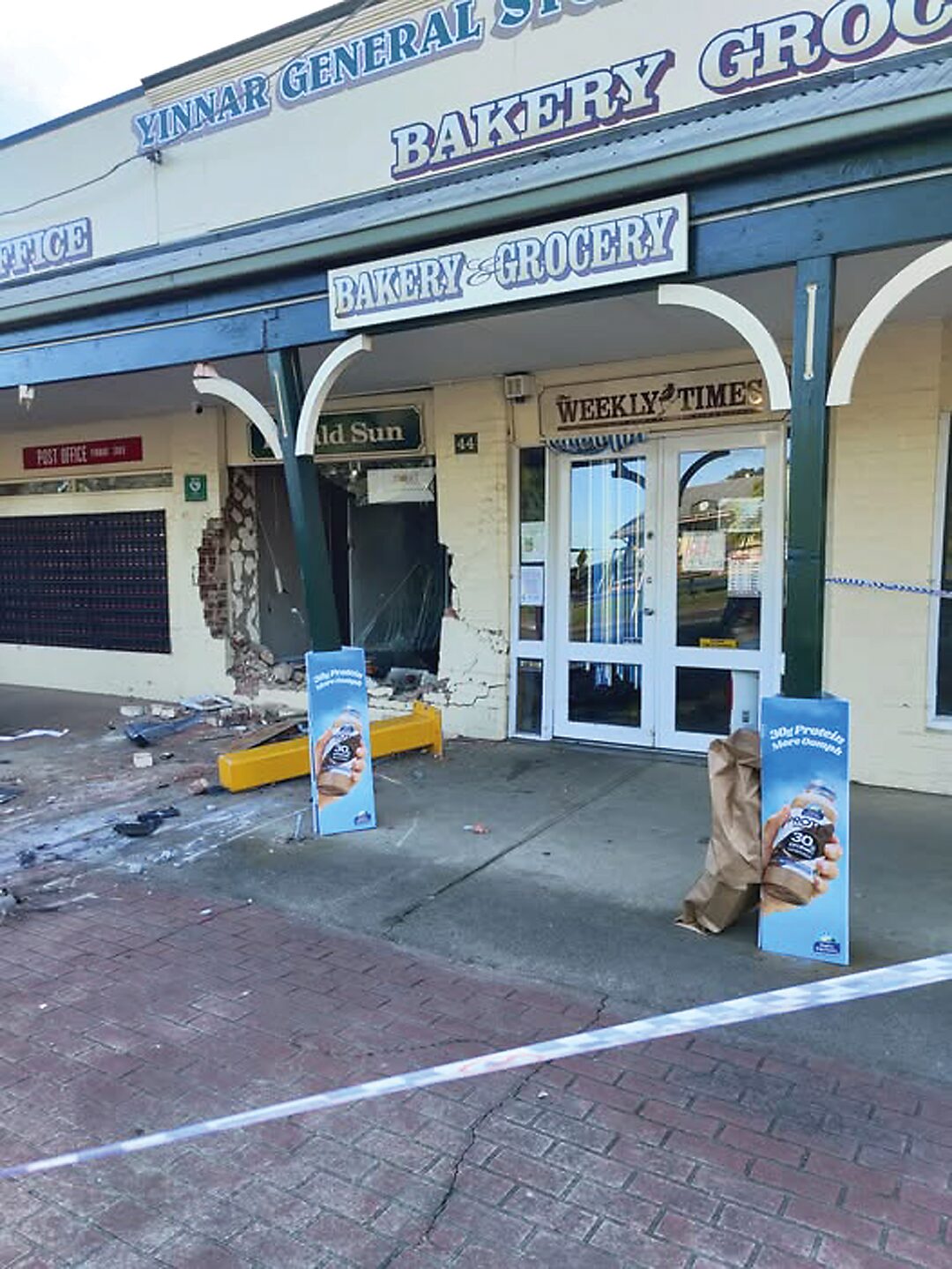 Ms Gailberger and Stuart Booth of Yinnar Bakery, Coffee Shop and Groceries were awoken in the early hours of the morning, being told that their business had been rammed into repeatedly and that the public ATM had been ripped out of the front of the store.