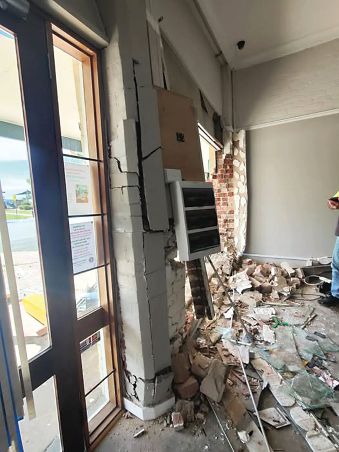 The front door was poleaxed by the truck, making it impossible for it to be opened without seeing the entire front of the building collapse.