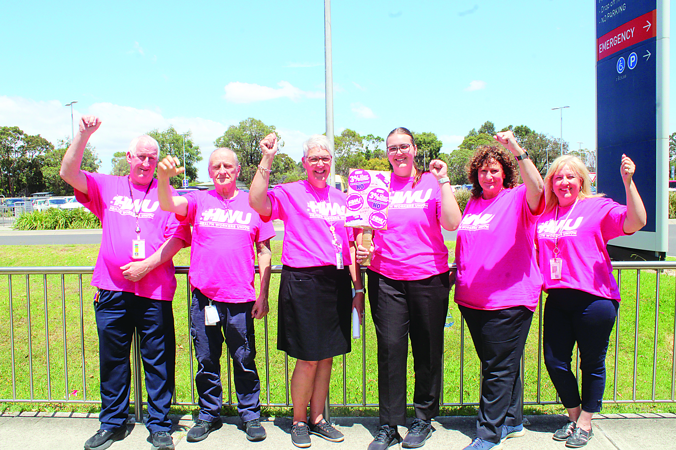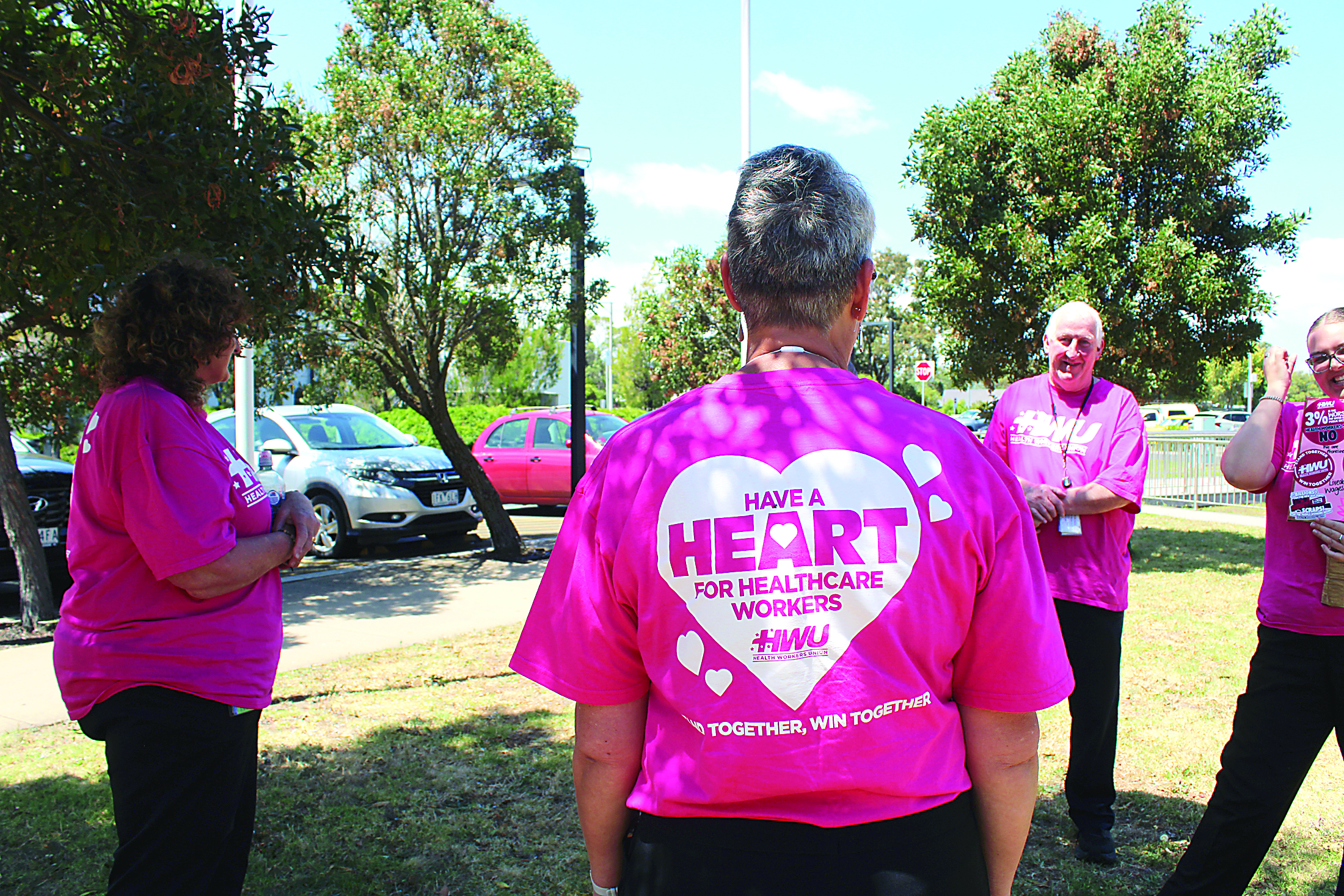 DECKED out in bright pink on Tuesday, January 20, a group of 11 healthcare workers and members of Health Workers Union (HWU) from Latrobe Regional Hospital (LRH) took an hour out of their day to demand extra pay for healthcare workers.