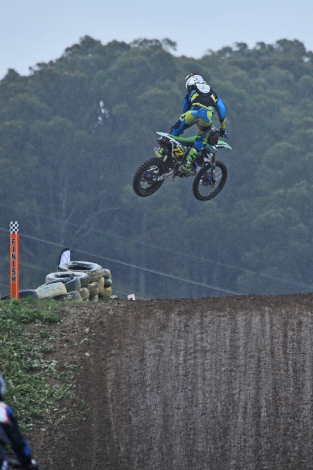Getting big air over the finish line at the Blue Rock Junior MX State Titles