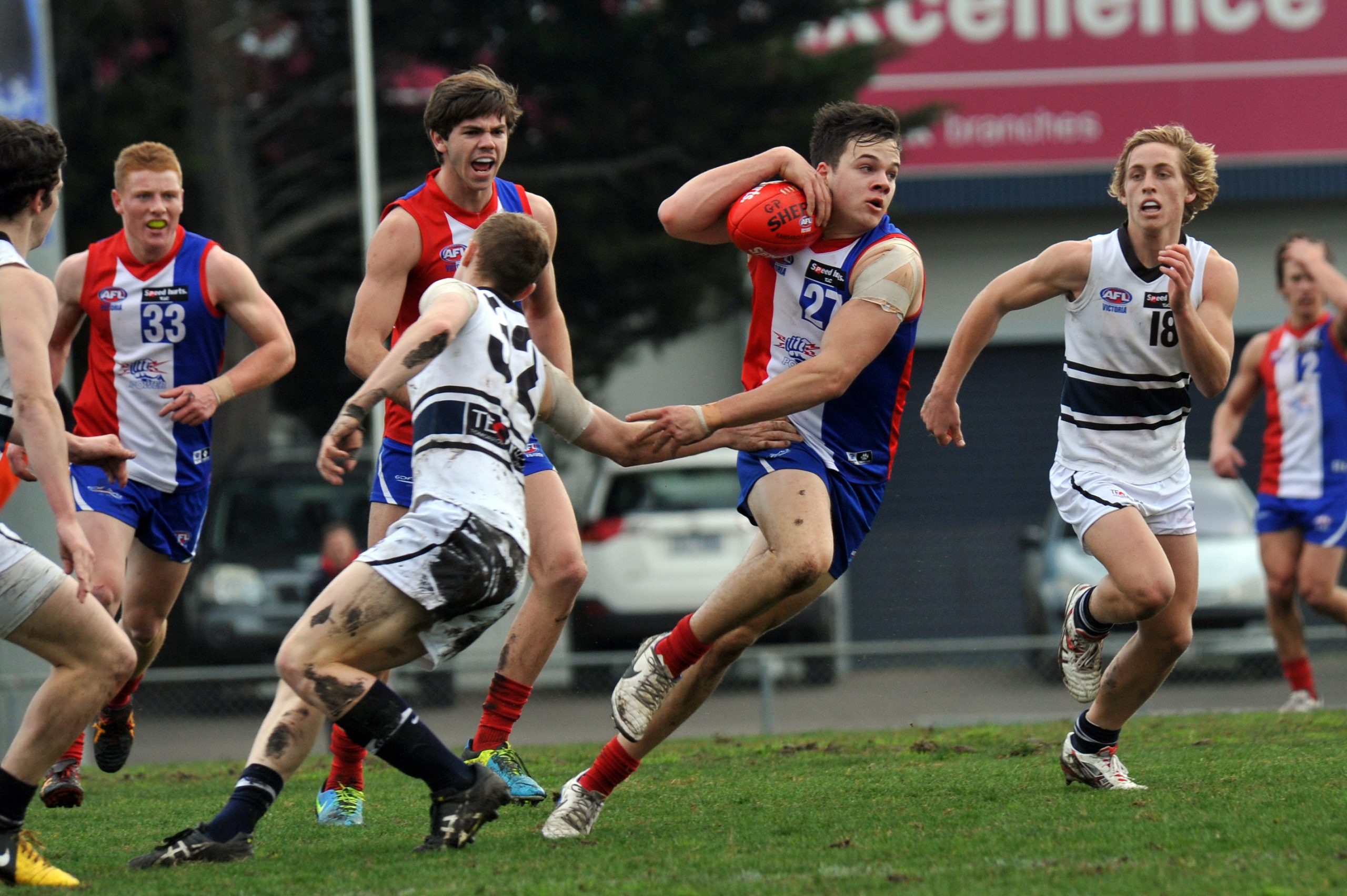 Leading the way was on-baller Nash Holmes, who applied just shy of 20 bone crunching tackles, inspiring fellow on-ballers Alex Carr, Josh Dunkley and Tom Papley to follow suit.