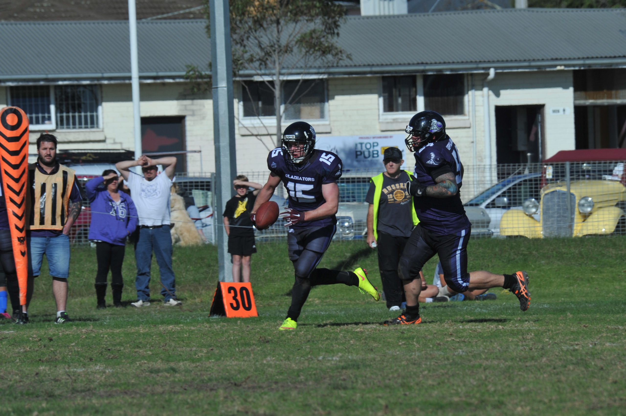 The Gladiators drew first blood in Morwell with a precision pass to wide open receiver Cody Bates, who ran it in for the first touchdown of the game but failed to convert for the extra point.