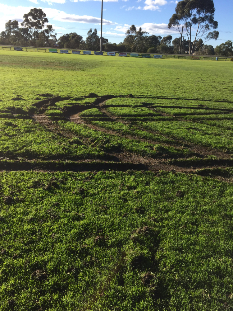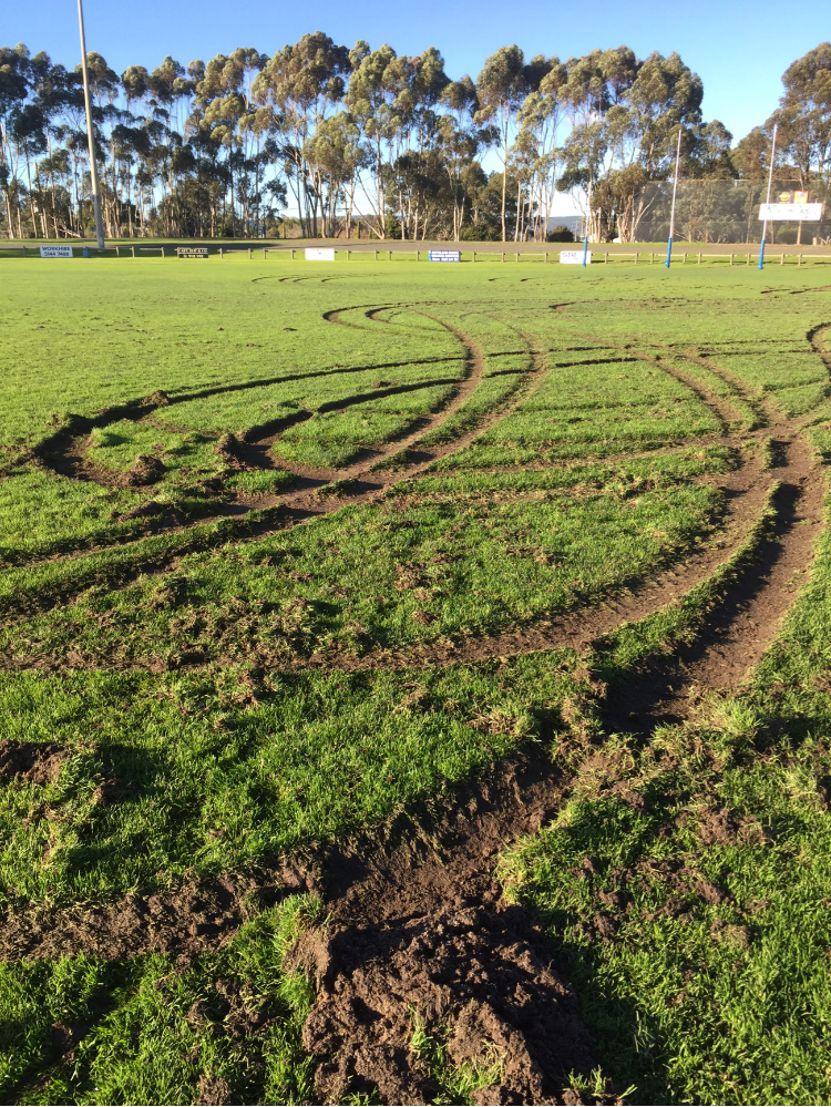 The turf at Rosedale Recreation Reserve was afflicted with extensive wheel ruts from vehicle abuse about 10.30pm last Wednesday night which severely chopped up the main football oval.