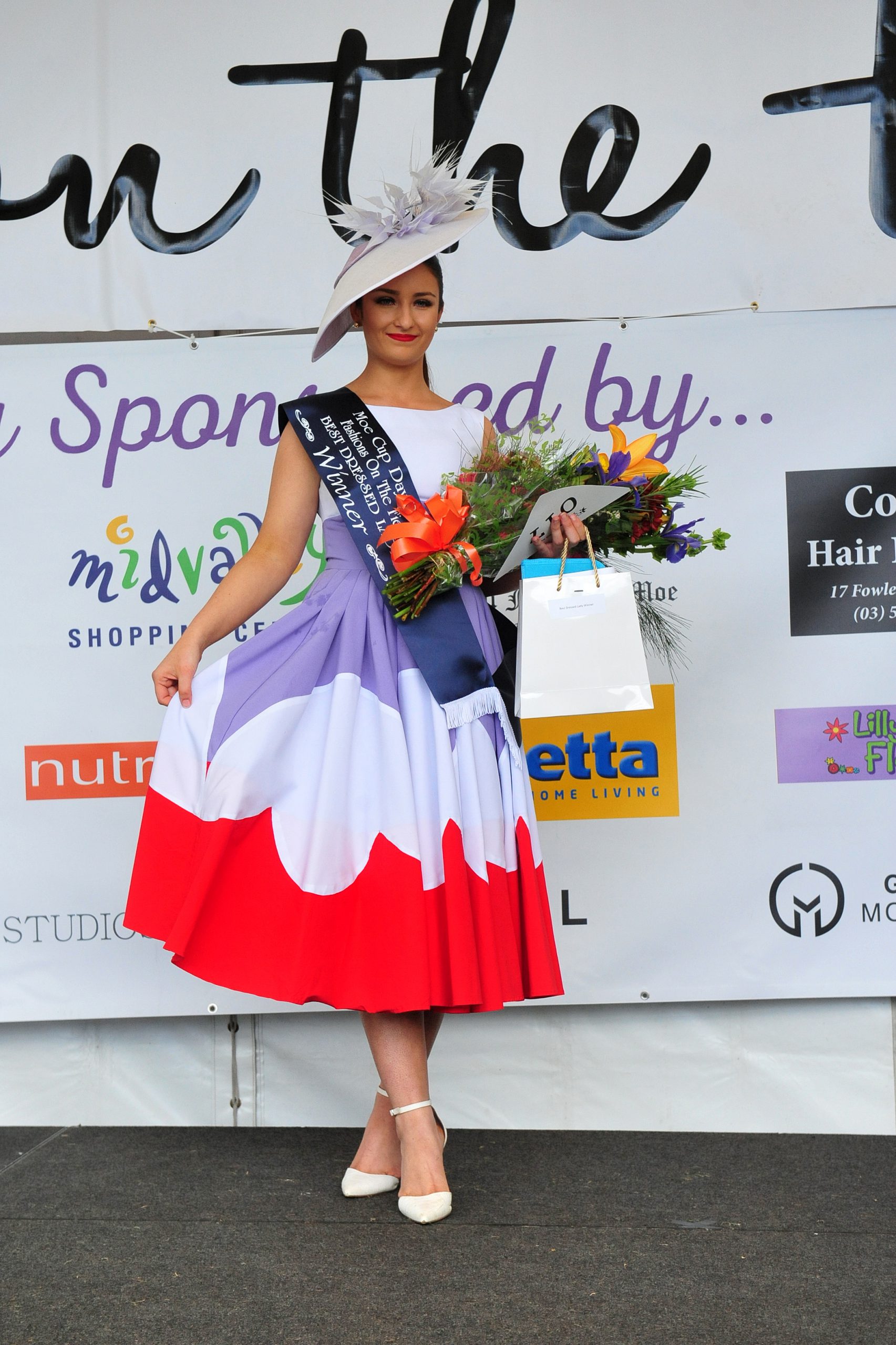 Traralgon’s Chloe Davis was named best dressed at the Moe Cup for her white dress, which featured clashing mauve and red sections.