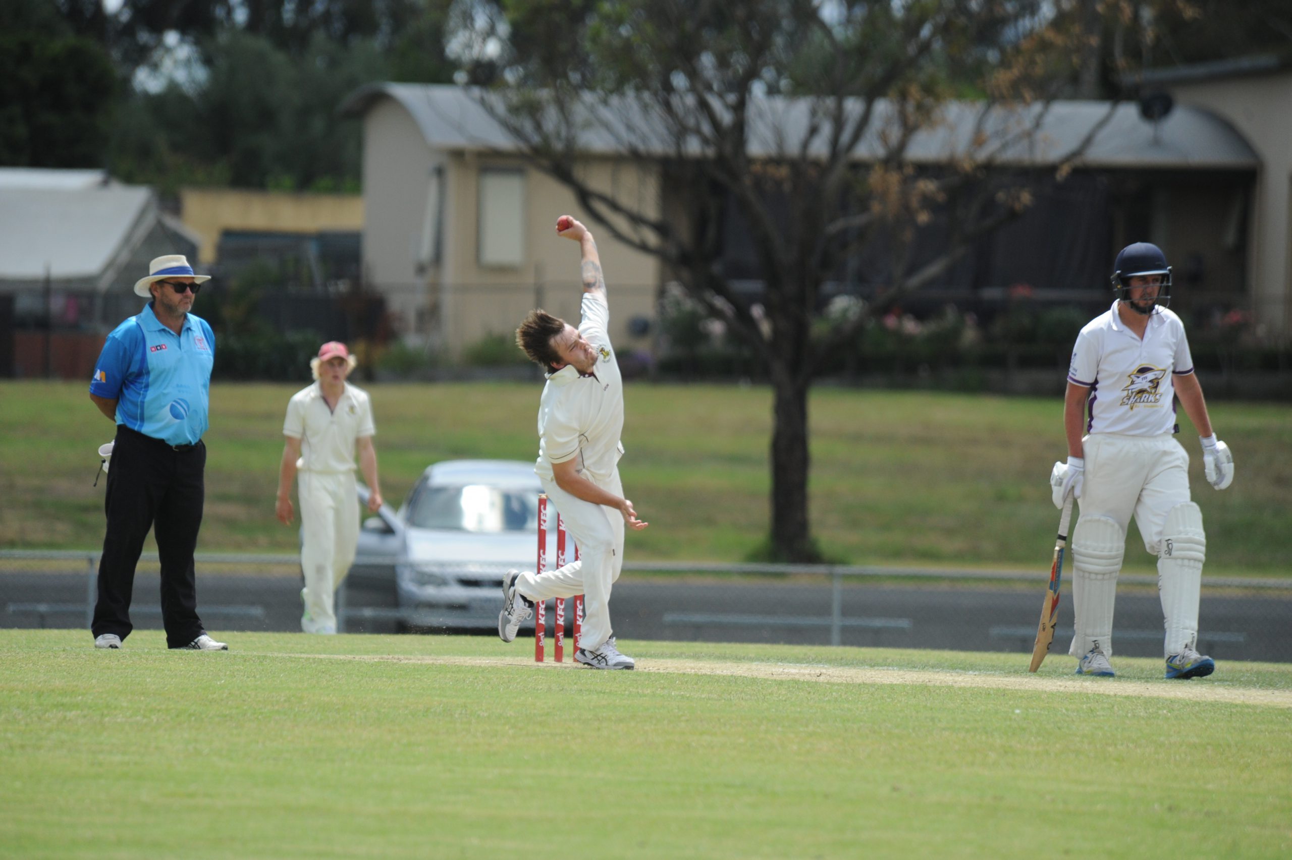 Bohdi Walker (duck) and Travis Switzer (two) were Harvey’s next victims and when Burgiel fell for 76, the visitors looked in trouble at 7/121.