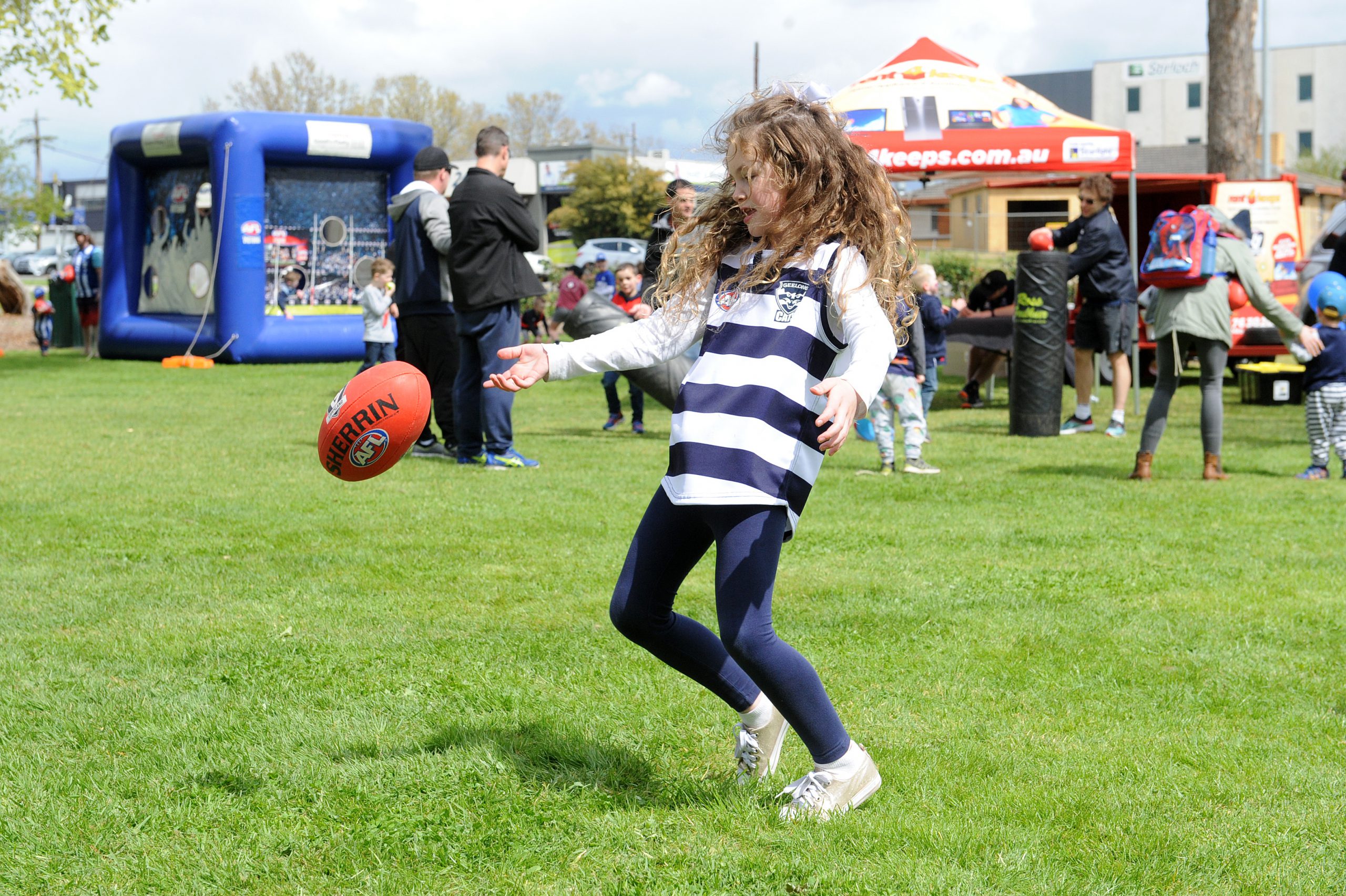 Budding AFL and AFLW stars honed their handball skills with target practice, tested their agility through obstacles and mastered set shots on goal.