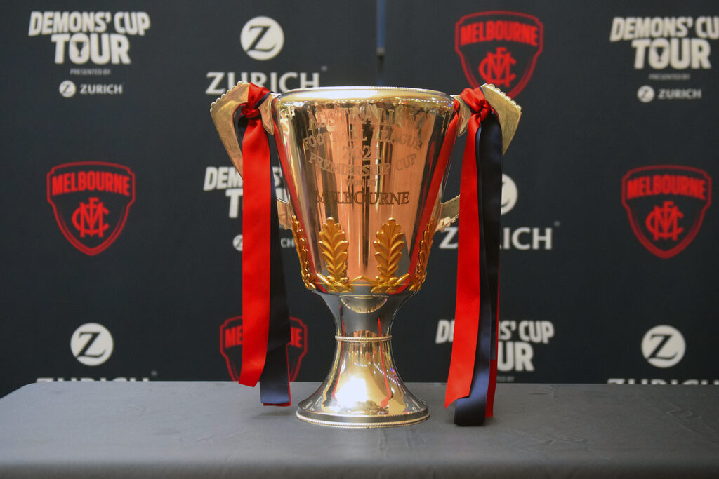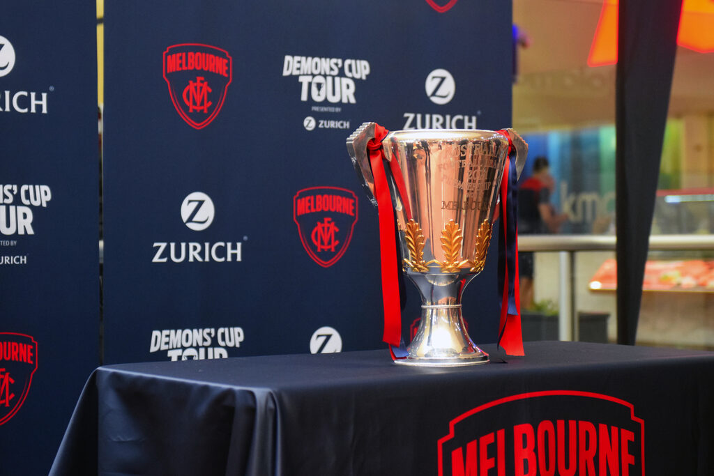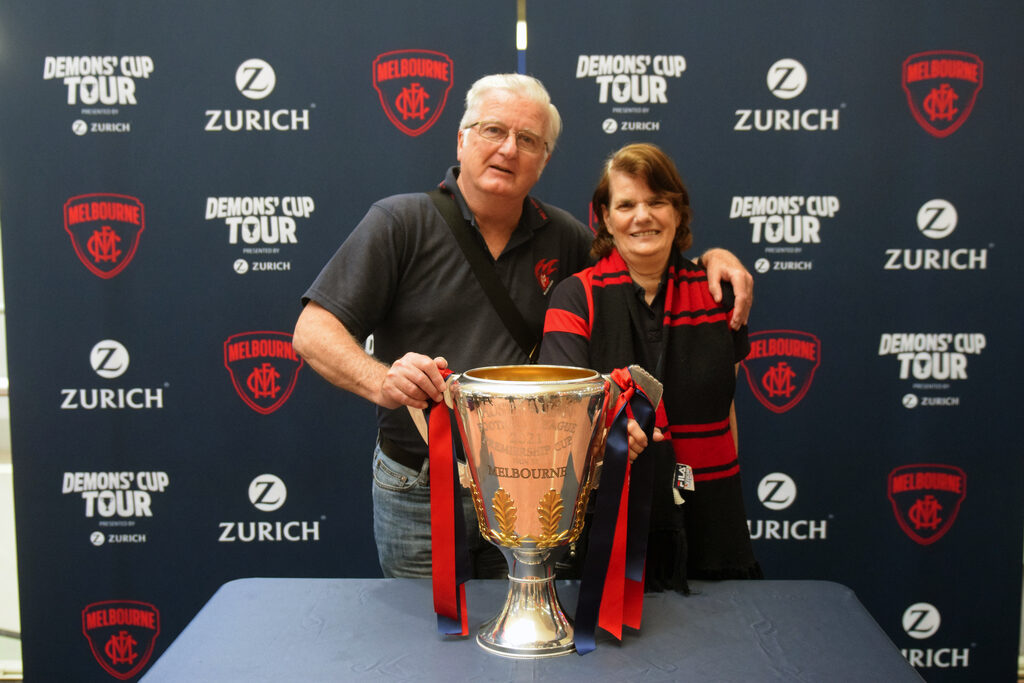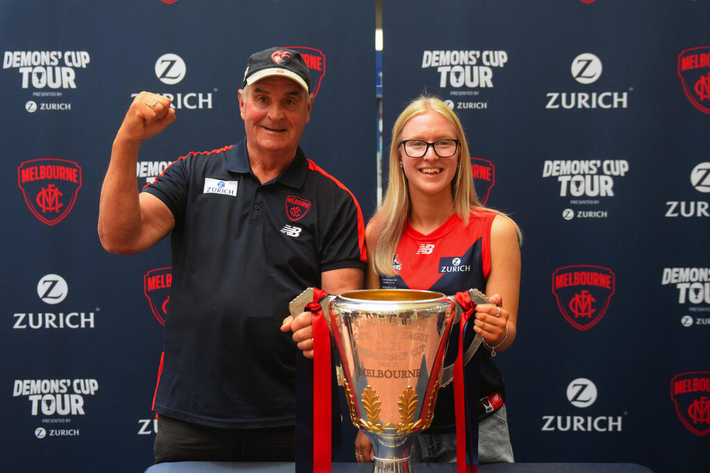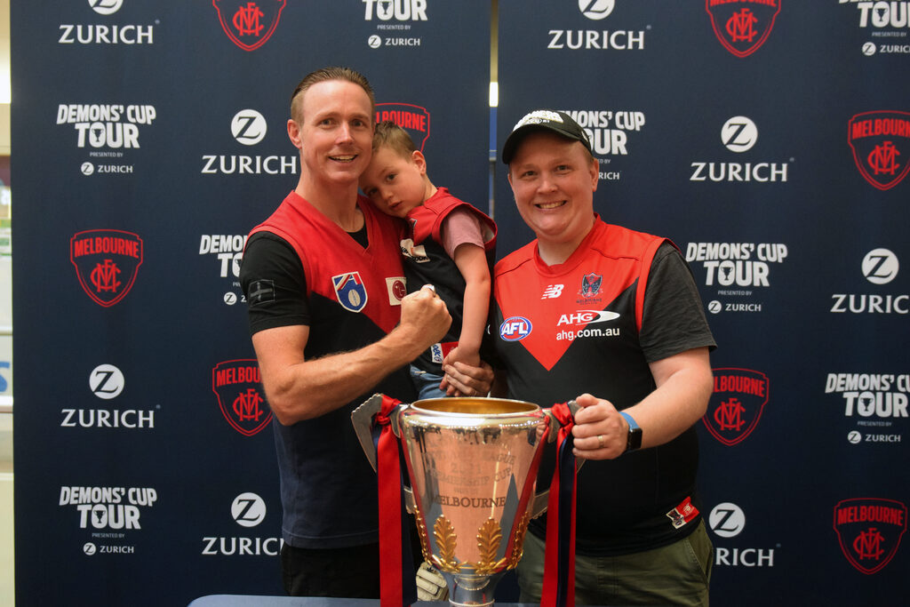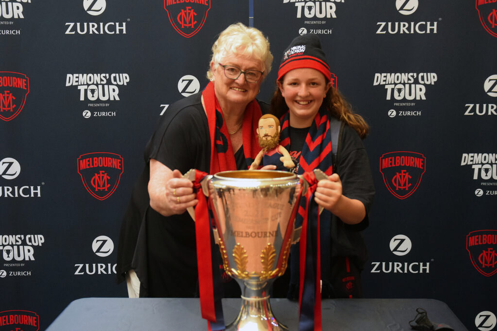 By LIAM DURKIN DISNEYLAND may well have been briefly overtaken as the happiest place on Earth last week, as the Melbourne Football Club brought their AFL premiership cup to Gippsland as part of the ‘Demons’ Cup Tour’. Demon supporters converged on Traralgon Centre Plaza on Wednesday to catch a glimpse of the premiership cup, the very same cup that signalled the end of a 57 year drought once it was held aloft by coach Simon Goodwin and captain Max Gawn in Perth last month. Fans travelled from as far as Lakes Entrance to see the cup in the flesh, and were grinning from ear to ear the moment they laid eyes on the AFL’s holy grail. Supporters from across the generations came decked out in red and blue. Youngsters wore their favourite player’s number on the back of jumpers, while those of an older vintage came bearing old-school woollen guernsey and tattered bomber jackets from years gone by. The number of times those woollen guernsey or bomber jackets have no doubt sat through a game in which Melbourne has been thrashed surely added to feeling that it has all been worth it once in the presence of the premiership cup. It was truly wholesome content as a long line of Melbourne diehards waited patiently to have their photo taken with the cup, with each supporter well and truly lapping up the opportunity to be able to say ‘it finally happened’. Every supporter added to the long list of people who have no doubt felt, held and maybe even drank out of the Demons 13th premiership cup since grand final day, contributing another piece to a story that would indeed be an eye opening one if the cup itself could talk – to think of the places it went and the liquid content it held in the days after the AFL decider. With the word ‘Melbourne’ emblazoned in gold capital letters on the front officially stamping the Demons as AFL premier, supporters coming to Traralgon were left in no doubt that this was the real-deal premiership cup and not some el-cheapo replica. Fans were permitted to lay hands on the cup, although it had to stay planted on a cloth table to minimise the risk of damage. Melbourne staff generously held supporters phones to allow them to get their photo taken, and in a sign of the times, sanitised the handles on the cup after every person had touched it. Although no Melbourne players made the trip down, this did not seem to worry fans, as the chance to see a piece of history was all they needed. Some clearly became lost in the moment, with a group of mates breaking out into a stirring rendition of “It’s A Grand Old Flag” to rapturous applause. Even a security guard standing table-side to where the premiership cup was couldn’t help but smile at that point. Morwell’s Daryl Smith and granddaughter Emmersyn Smith came to Traralgon to see the cup. For the senior Smith, who has been a supporter for 60 years, he said he honestly thought he would never see Melbourne win a flag. “I’ve been there thick and thin, seen them at their best and worst,” he said. “In the grand final I was worried about halfway through the third, but then I couldn’t believe what was going on (when Melbourne kicked six goals in nine minutes).” As well as Traralgon, the ‘Demons’ Cup Tour’ has made its way to Shepparton and will be heading to Geelong, Ballarat and Warrnambool in coming weeks. Melbourne chief executive officer Gary Pert said it was great to be able to connect with supporters, especially after they were denied the chance to see the grand final in Melbourne. “It’s ‘the People’s Cup’ and it was really important for us to share it with as many Melbourne members and supporters as possible,” he said. “Bringing it to the town of Traralgon has allowed us to share in the celebrations with the local community. It’s so special, as it reinforces what it means to all those who are proud to belong to our great club. “We hope today’s visit has brought a lot of smiles to our supporters’ faces.” With a big road trip ahead, Melbourne hopes to get to as many supporters in as many locations as possible. There is however one place the premiership cup won’t be making its way to – Footscray.