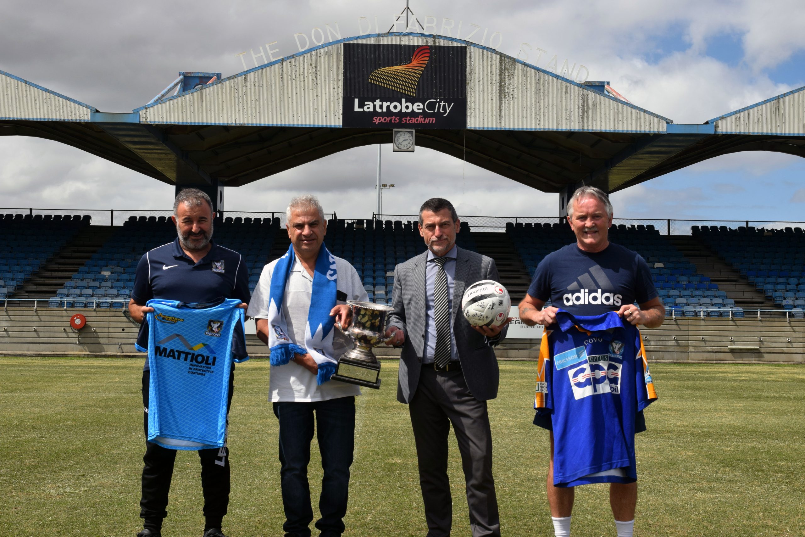 Honouring a true giant: Falcons 2000 Soccer Club will hold a tribute this Saturday in memory of Don Di Fabrizio. Standing in front of the stand bearing his name are Falcons 2000 coach Mark Cassar, Falcons life member Peter Viggiano, Falcons president Tony Salvatore and past player Tommy Leckey. photograph liam durkin