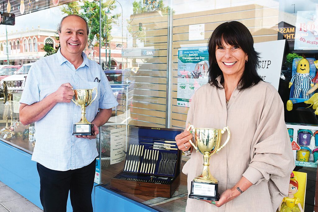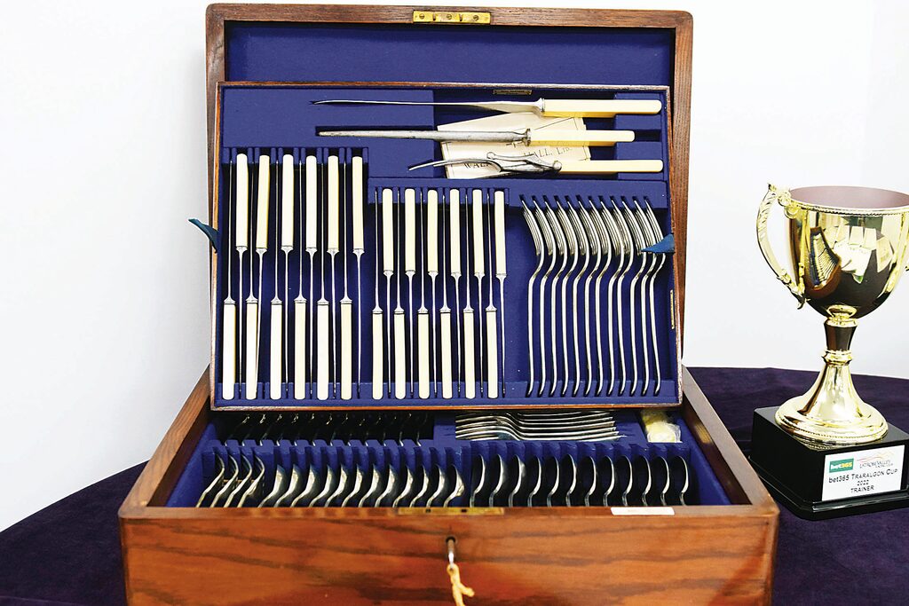 Old and new: Latrobe Valley Racing Club chairperson Frank Bezzina and Traralgon News and Lotto design manager Elly Costani holding this year's Traralgon Cup trophies, flanking the 1930 Traralgon Cup cutlery set trophy in the background. photographs liam durkin