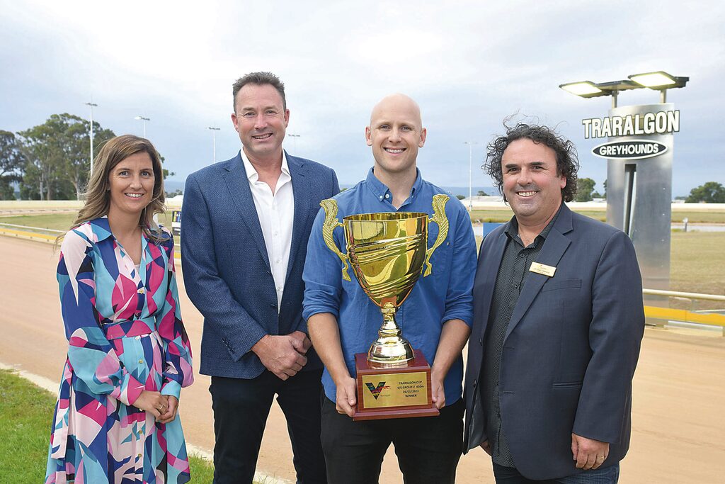 Holy grail: Traralgon Greyhound Racing Club manager Olivia Alcock, Member for Morwell Martin Cameron, AFL great Gary Ablett Jr, and Latrobe City deputy mayor Dan Clancey with the Traralgon Cup. photographs liam durkin