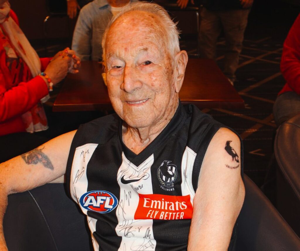 By ZAIDA GLIBANOVIC YOU’RE never too old. The 96-year-old Magpies-mad Jack Darling forever memorialised his love for the 2023 premiership team on his skin – recently going under the tattoo needle. Heading to Blackscot Tattoo shop on Tarwin Street, Morwell, Darling had his mind and heart set on a Magpie tattoo. “Well I said when Collingwood made the Grand Final, I said if they win the Grand Final, I’ll get a tattoo,” he laughed. Following through with his word fresh off that premiership elation, it was straight to the ink shop for the diehard fan. “I’ve been a staunch Collingwood barracker since I was 10-years-old,” Darling proudly said. “I had an old uncle and aunty that lived in Abbotsford which is not far from Victoria Park. So, me and my brother, he’s a bit older than me, he said ‘I’ll take you to the football’. “We got there and my brother said ‘I’m gonna barrack for the navy Blues’ so I said ‘I’m gonna barrack for the mighty Magpies’.” Having been alive for 11 out of the 16 Collingwood premierships, Darling said this flag was incredibly special. “They’re just a wonderful team. The coach and that – they’re just magnificent,” Darling said. Still over the moon about Collingwood’s premiership, Darling said he hopes to add more Magpie related ink to his Collingwood collection – already planning for another tattoo if the Pies get up again next year. “I’ll be getting another date on my arm if we do (go back-to-back),” he said. “I’m 96-years-old, I might not be there then but I’m hoping I will be.” A footy fan through-and-through, Darling has followed every Pies game closely. With the narrow winning margins the team has had over the last few years, you’d think Darling’s heart would need a check-up. “I watch every game on the telly, I watch any football – I’m just mad on football,” he said. Everyone knows just how mad Darling is for the Pies. Having had his 96 birthday earlier in the year, Morwell Neighbourhood House organised a surprise birthday party for him. Morwell Neighbourhood House was nice enough to go to great lengths to arrange a Collingwood signed jersey for Darling, with every single players inscription decorating the grand birthday gift. Recalling his birthday, Darling proudly told the Express about his amazing gift and how “everyone on the Collingwood list has signed it”. Latrobe City Councillor and Morwell Neighbourhood House Manager, Tracie Lund said “Jack is a passionate Collingwood supporter and we gifted him a jersey signed by this year’s players”. “After Collingwood’s incredible Grand Final win Jack got a tattoo of his beloved Pies. A fitting tribute for the victory,” she said. “You are one cool cat, Jack. I want to be just like you when I’m 96.” Though Darling’s love of the Magpies is clear to see, in plain sight on his shoulder, he said that if his wife we’re still alive today, perhaps she wouldn’t take too kindly to the body modification. “My wife passed away about two years ago now after 73 years of marriage …. that’s a very long time … it would have been interesting if she was still alive about the tattoo business … I don’t think she would’ve liked it,” he laughed. Passing on his love of Collingwood to his youngest son, Darling said his youngest was definitely “mad on Collingwood”. Readers will rejoice in the fact that the photos taken of Darling’s tattoo were before the 96-year-old returned to the tattoo shop to get the Magpies feet inked on and the tattoo complete. “When I first got it I got home and I didn’t notice it but nearly everyone that looked at it said ‘it hasn’t got any feet”, and I looked and it didn’t have feet,” Darling chuckled. “I had to go back and get the feet on, so that made it okay”. Darling was the oldest person the tattooist at Blackscot Tattoo had ever tattooed – and perhaps one of the coolest.