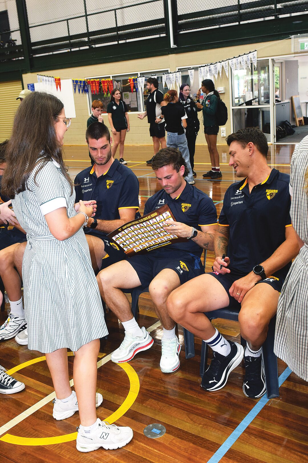 Students of all year levels packed into the school gymnasium to converse with some of the Hawthorn stars, including Dylan Moore, Blake Hardwick, Josh Battle, Massimo D’Ambrosio and Nick Watson.